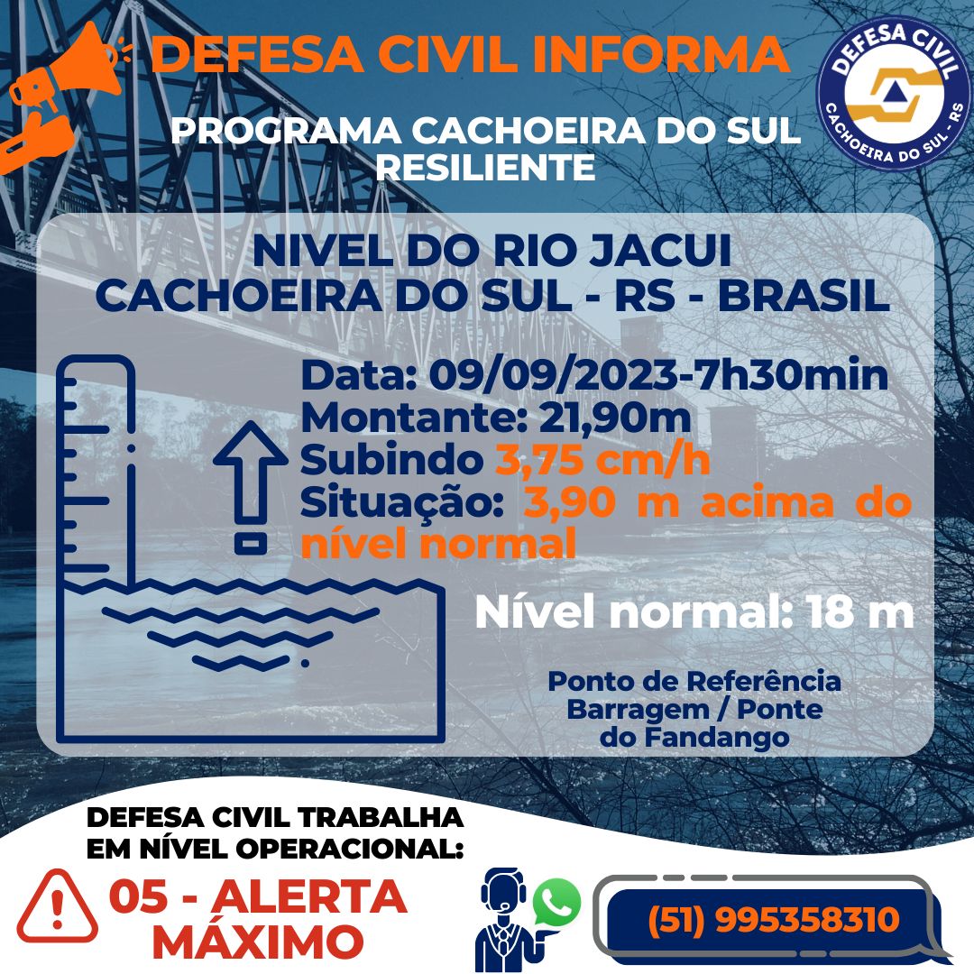 O Rio Jacuí, em Cachoeira do Sul, chegou ao nível de 21,90m na manhã deste sábado e está subindo 3,75 cm/h. Devido a isso, a Prefeitura de Cachoeira do Sul, através da Defesa Civil, está neste momento fazendo uma vistoria da situação para avaliar a necessidade de remoção de mais famílias ribeirinhas.