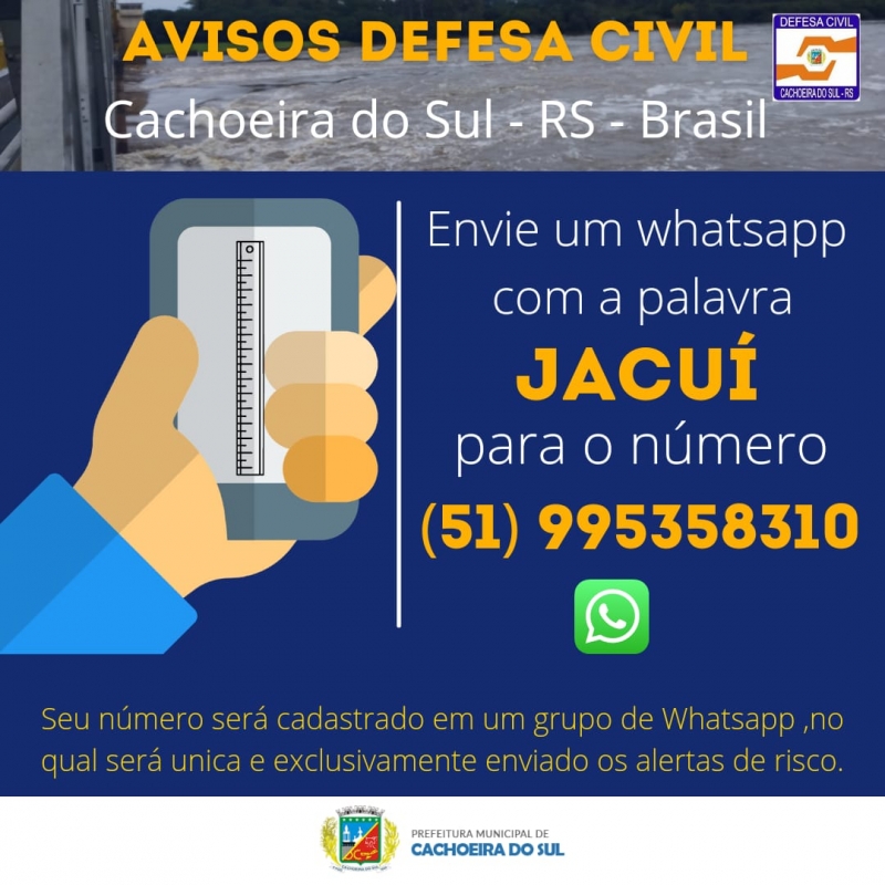 A Prefeitura Municipal de Cachoeira do Sul através da Defesa Civil, lança através da rede de comunicação WhatsApp, um canal de comunicação para a população receber informações sobre alertas de risco para eventos adversos e nível do Rio Jacuí no Município.