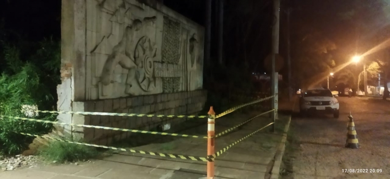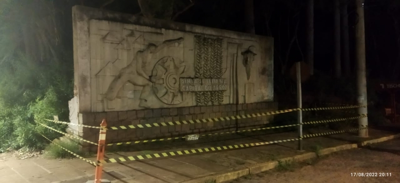 A Coordenadoria Municipal de Defesa Civil precisou isolar na noite desta terça-feira (17) o monumento “Sinta-se Feliz na Capital do Arroz", instalado na esquina da Rua Andrade Neves da Fontoura com a Rua Virgílio de Abreu.